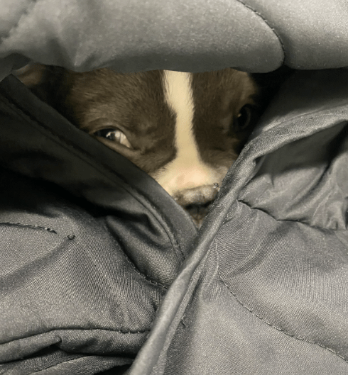 Since we weren’t allowed to take him out for real walks yet, I bundled him up tightly like a little burrito and took him to the office with me instead. 😆