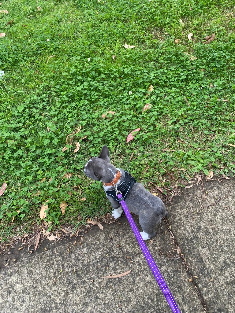 Following the vet’s advice, we chose a quiet area for his first outing—just a short 10-minute stroll on the sidewalk near my office during lunch. 🌲