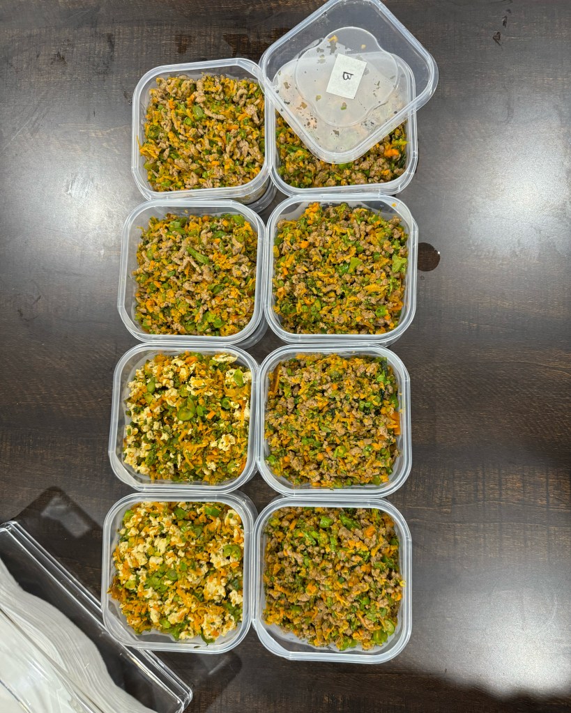 To keep things fun and varied for Zero, we labeled the containers with masking tape (e.g., B for beef, C for chicken, L for lamb, T for turkey) and rotated the flavors daily.